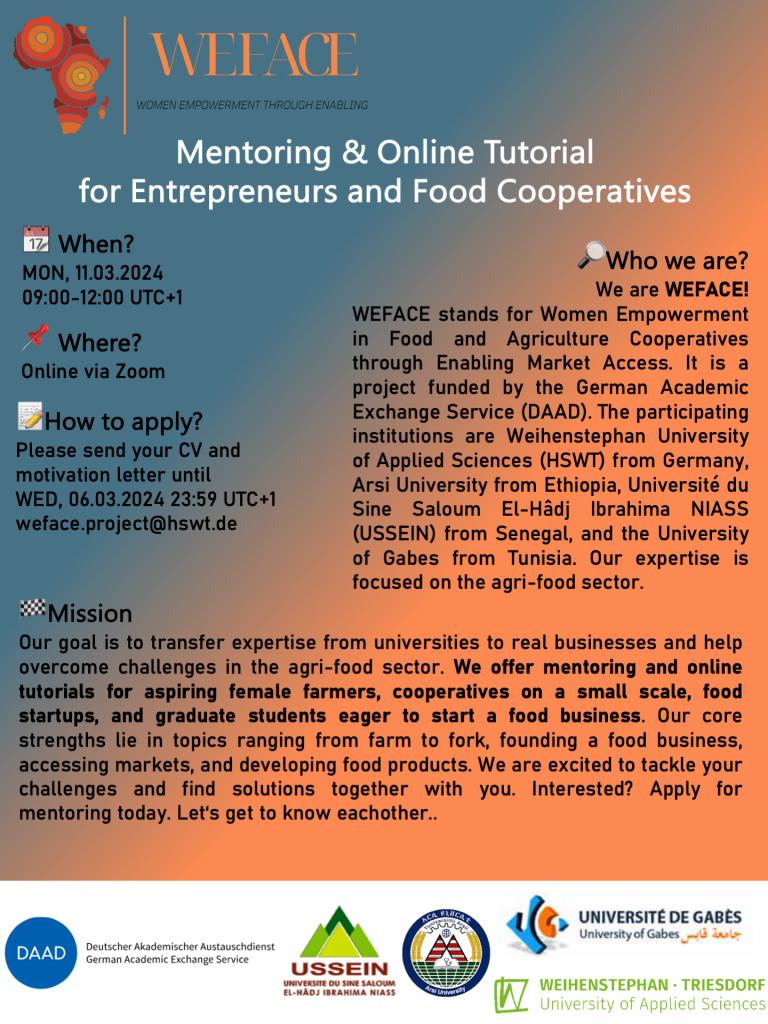 - Mentoring & Online Tutorial for Entrepreneurs and Food Cooperativesby AdminOur goal is to transfer expertise from universities to real businesses and help overcome challenges in the agri-food sector. We offer mentoring and online tutorials for aspiring female farmers, cooperatives on a small scale, food startups, and graduate students eager to start a food business. Our core strengths lie in topics ranging from farm to… Read more: Mentoring & Online Tutorial for Entrepreneurs and Food Cooperatives